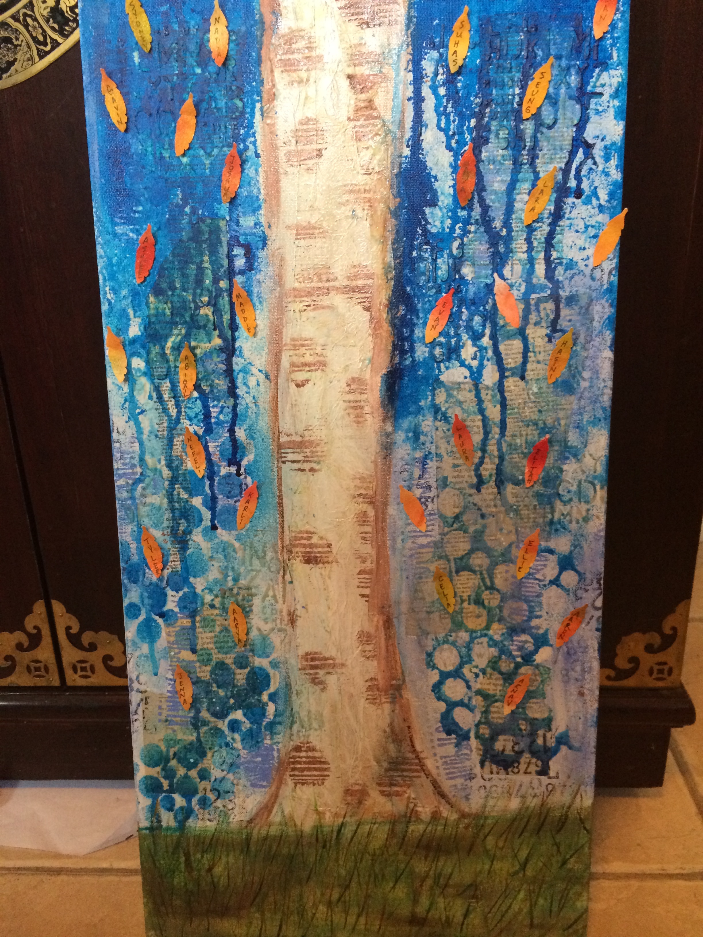 I can’t tell you how much fun it was. I think I was more excited by their enthusiasm then they were by watching me. However, thirty minutes happens really fast. I am not use to creating that fast, and was grateful for my plan. Without it I would have failed. I am also grateful I took my head gun to dry sections while I answered questions. I did have to take the canvas home to finish up the sides and correct the mistakes on the grass I made. I also finished gluing all the leaves on at home.