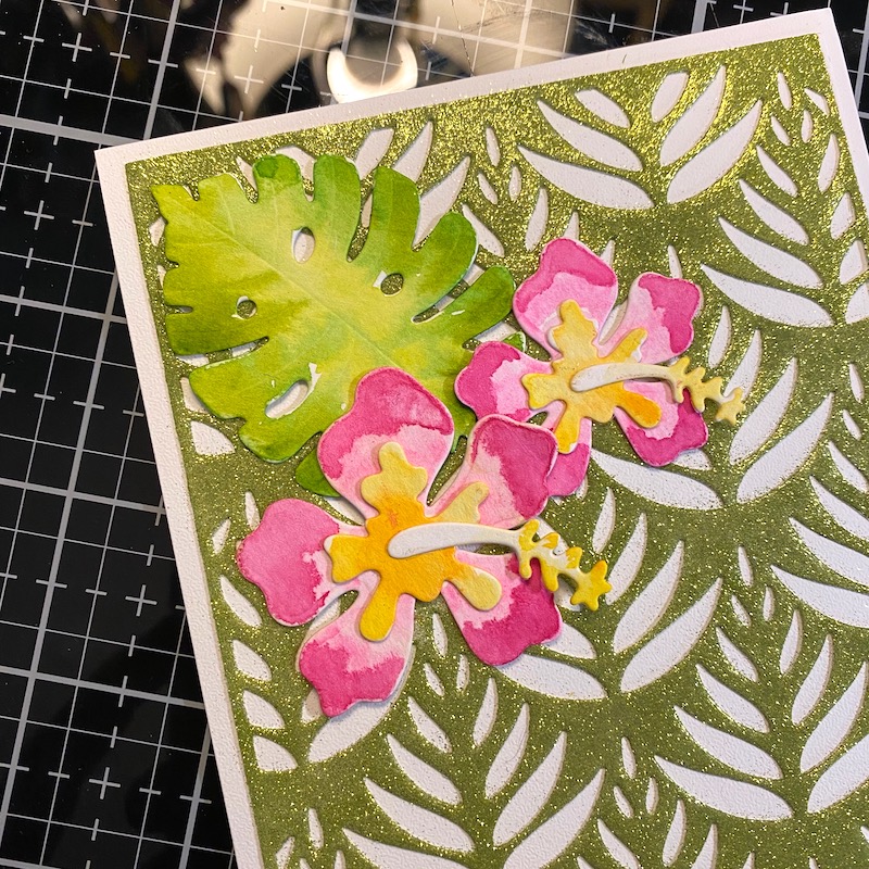 Step Eight: Adhere the Tropical Floral die cuts to the background.