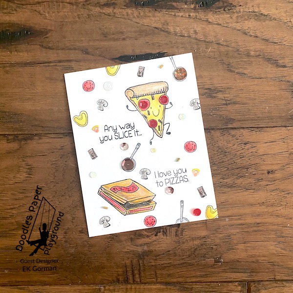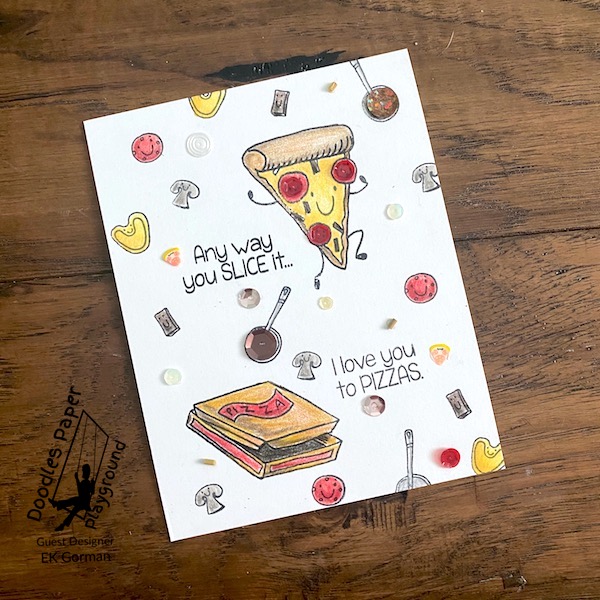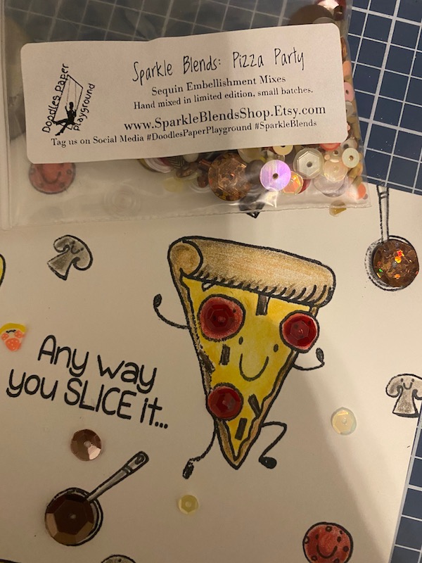 Hey Everyone! Today I am popping in with a really fun guest designing project featuring Doodles Paper Playground‘s new Sparkle Blends. I love playing with these really fun sequin blends in non shaker card ways sometimes, and the new Pizza Party blend.