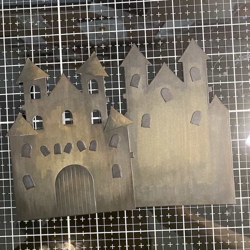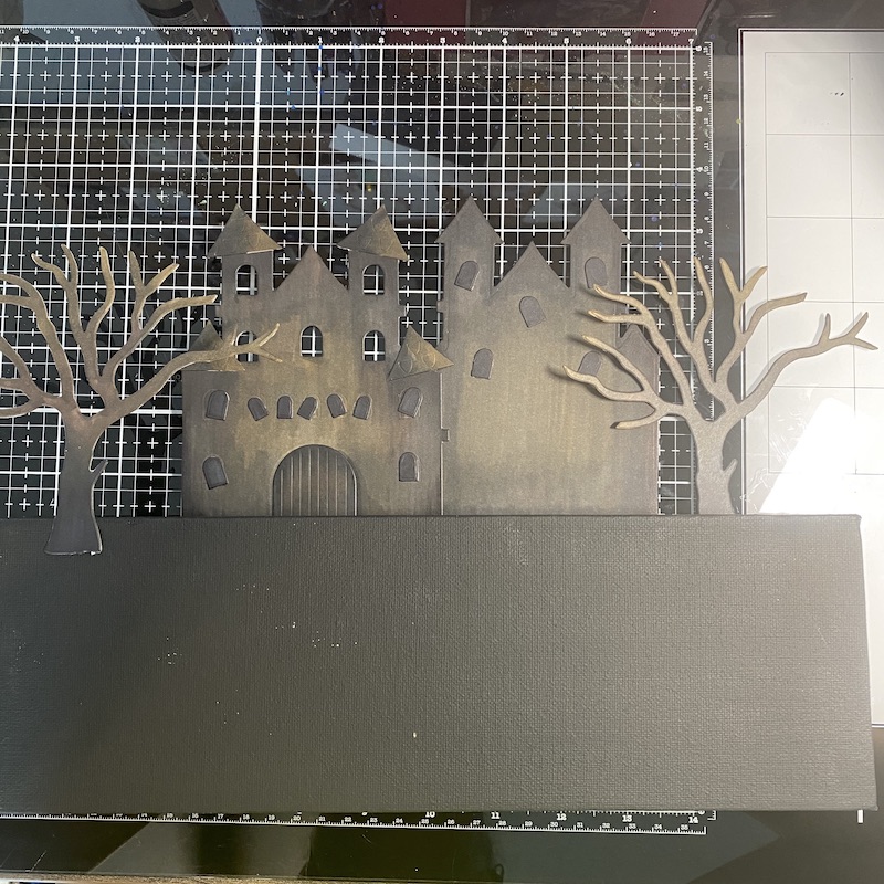 Step Four: Using hot glue, adhere both the castle die cuts and trees to the canvas. (I needed a little bit more quick stabilizing glue to make sure the die cuts stood up, so I used hot glue.)