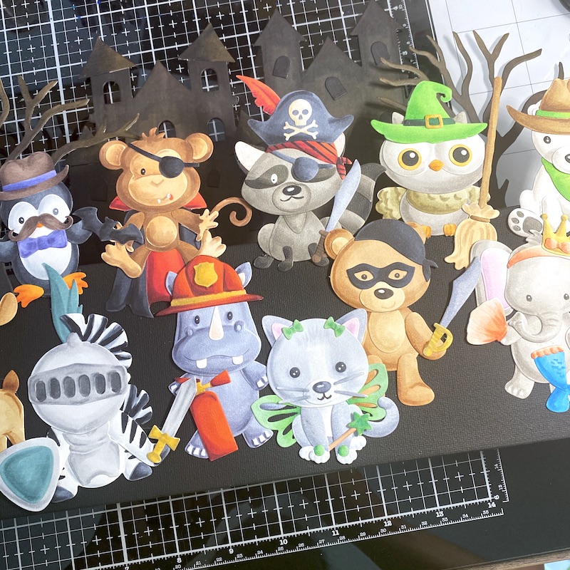 Step Five: Die cut the critters and their costume pieces out of 90lb Soft Finish Cardstock. Color the pieces with copic markers. Adhere the pieces with Kids Choice Glue. Below is a full list of each critter and where their costume came from.