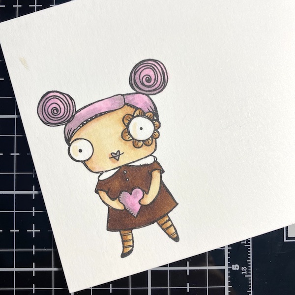 Step One: I started by stamping the image onto a piece of cardstock and coloring it in with my Nuvo Creative Pen Collection. I used a combination of Fair Skin Tones, Hazy Mauves, and Natural Browns. I then fussy cut out the image.