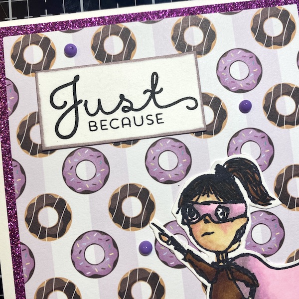 Step Seven: For the super girl I picked a donut themed paper and some purple Sparkle Cardstock and adhered them onto an A2 cardframe.