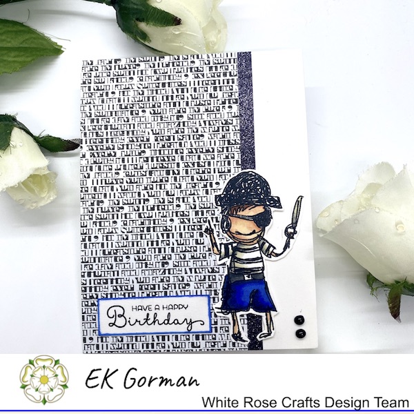 For the Pirate I picked a black and white themed paper and some Sparkle Cardstock and adhered them to an A2 card frame. I adhered the fussy cut images onto the card frames.