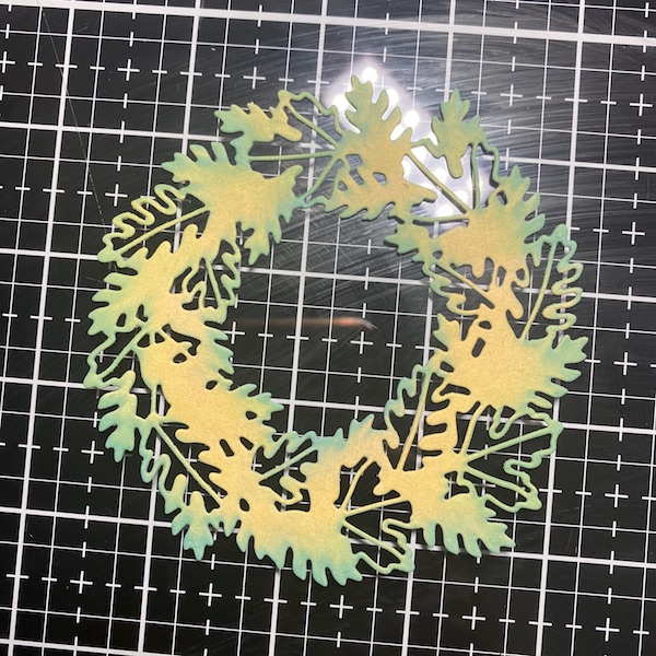 Using both Crushed Olive and Pine Needles Distress Oxides, I blended ink onto the die cut.