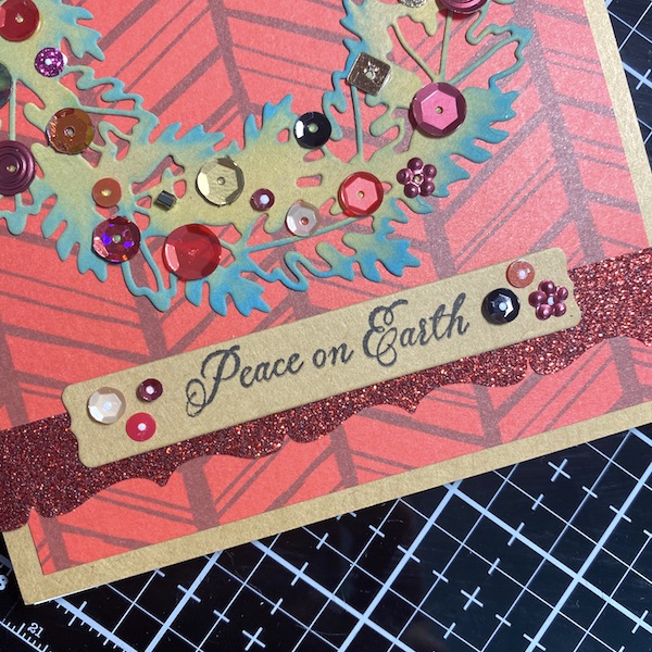 I build up a card frame with Kraft Paper and printed holiday paper. I adhered the paper wreath onto the card frame. Then using the the Mulled Wine Sparkle Blends, I had glued each sequin onto the wreath as if they were christmas baubles.