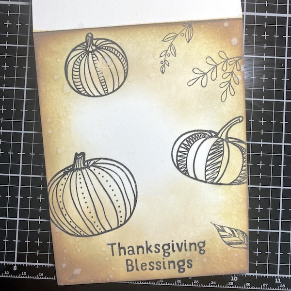 I then stamped some fun pumpkins and a sentiment onto an A2 card frame. I then blended brown Distress Oxides over the card frame. I used Brushed Corduroy, VIntage Photo and Walnut Stain. I then splattered the ink with some shimmer spray .