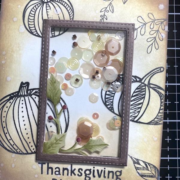 I added Eggnog with Nutmeg sparkle blend onto the card and added the colored frame to create a shaker pocket.