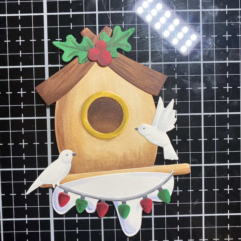 Step Five: Die cut the Holiday Bird House die set from 90lb Soft Finish Cardstock. Color the pieces with alcohol markers. Adhere the pieces together using Kids Choice Glue.