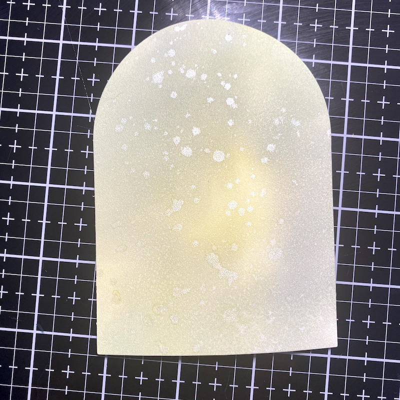 Step Six: Using one of the negative cuts from the Snow Globe top, blend ink over the background. I used Bundled Sage, Shabby Shutters, and Squeezed Lemonade Distress Oxides. Spray the ink with a shimmer spray.