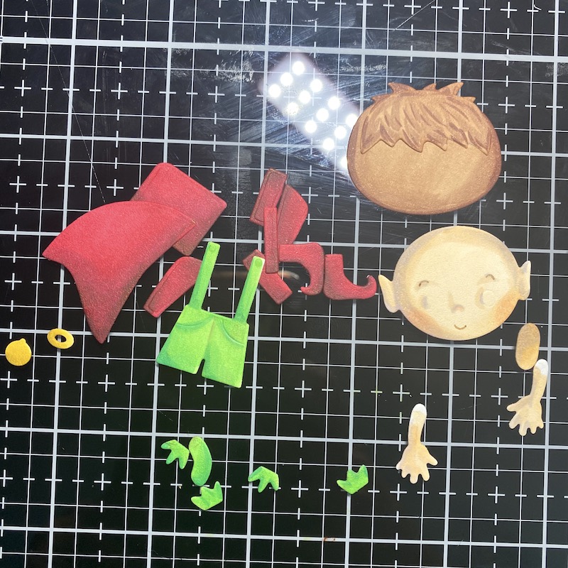 Step Two: Using alcohol markers, color the pieces of the die cut Holiday Elf- His. I used copics.