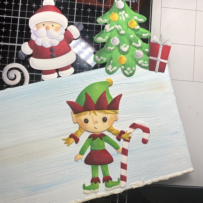 Step Fifteen: Adhere Santa to the back of the canvas. Add one of the trees and presents to the top of the canvas and one of the elves and candy canes to the bottom of the canvas on one side.