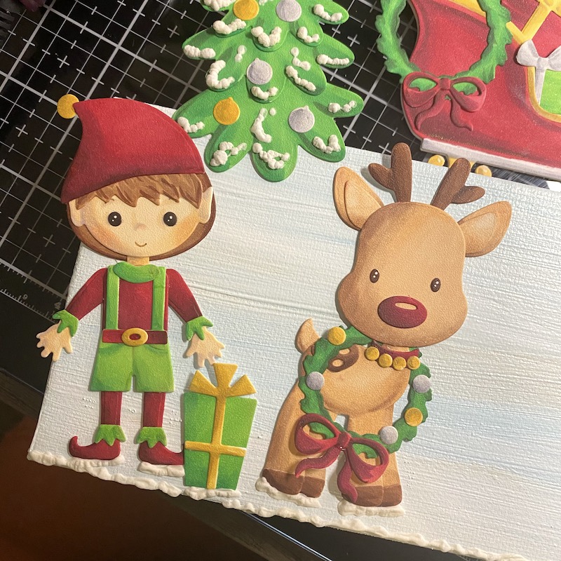 Step Sixteen: Add the other tree, elf, present and reindeer to the other side of the canvas. Use the Liquid Applique snow effect on the bottom of the canvas and the feet of the die cuts.