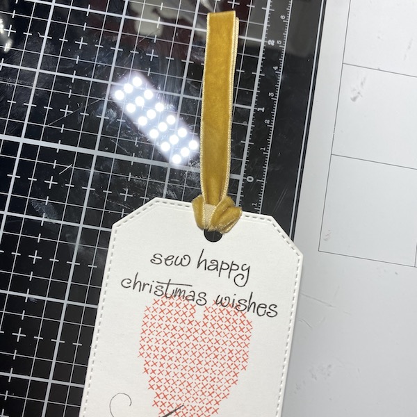 Then, using my stamping platform, I stamped the needle and thread and sentiment onto the tag using VersaFine Black Onyx. I did commit the crafting sin, and snipped the sentiment so I could put it on two lines. Totally worth it.