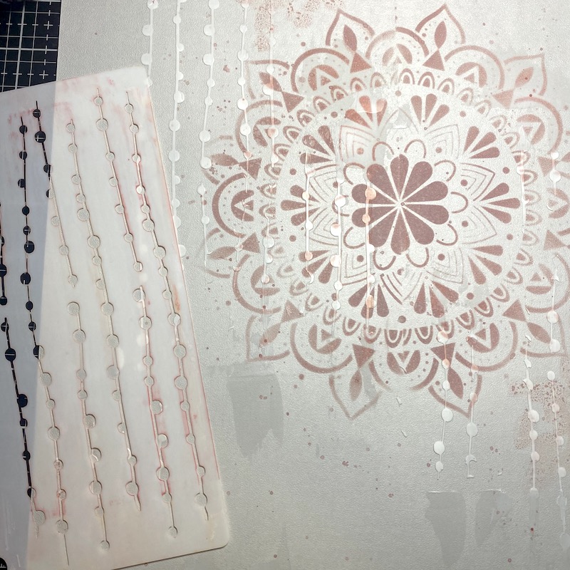 Step One: One a piece of 12×12 cardstock, blend ink through the Spring Flower Mandala stencil, flipping it over so that you create a full Mandala. I used Aged Mahogany Distress Oxide as my ink.