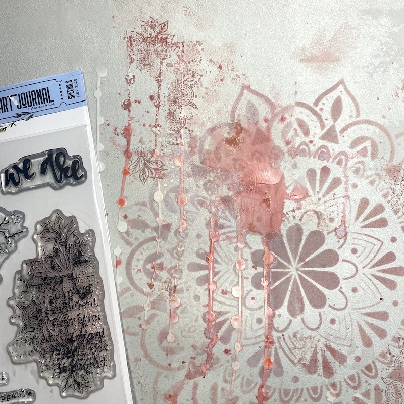 Step Four: Stamp more texture onto the page using the Words & Layers stamp set. I used more Aged Mahogany Distress Oxide to stamp. Spray liquid ink and water onto the page and let it run. I used Tattered Rose Distress Oxide Spray and Festive Berries Distress Ink Spray.