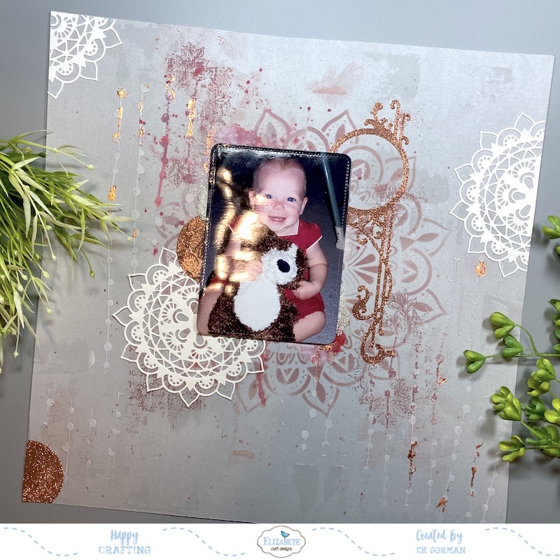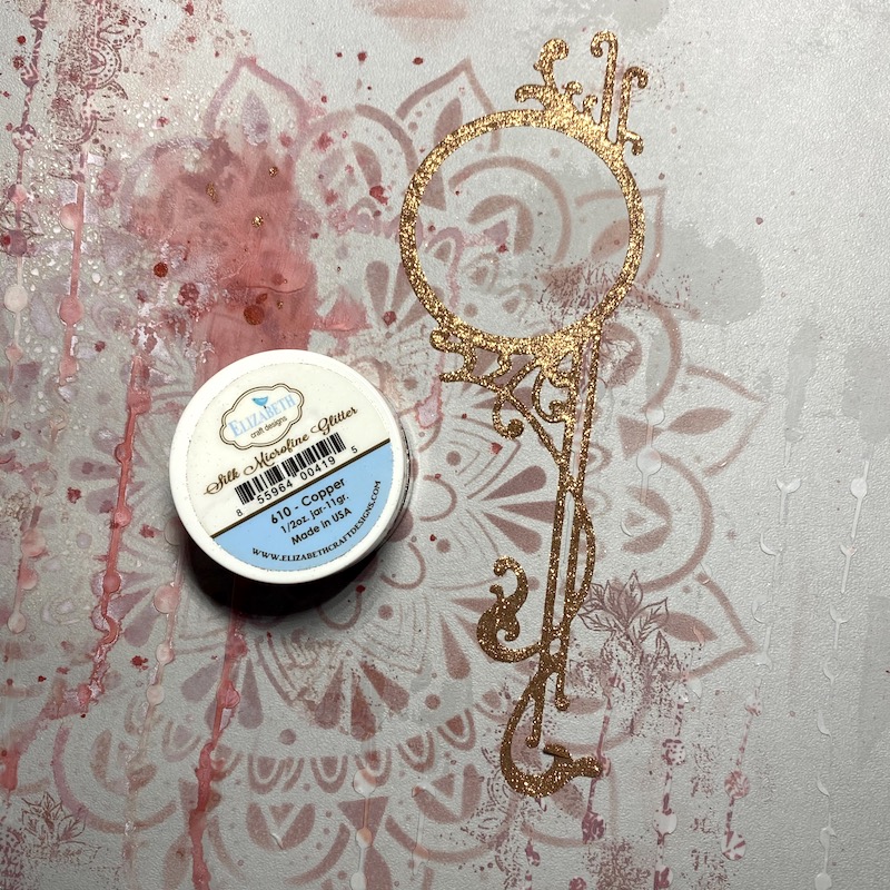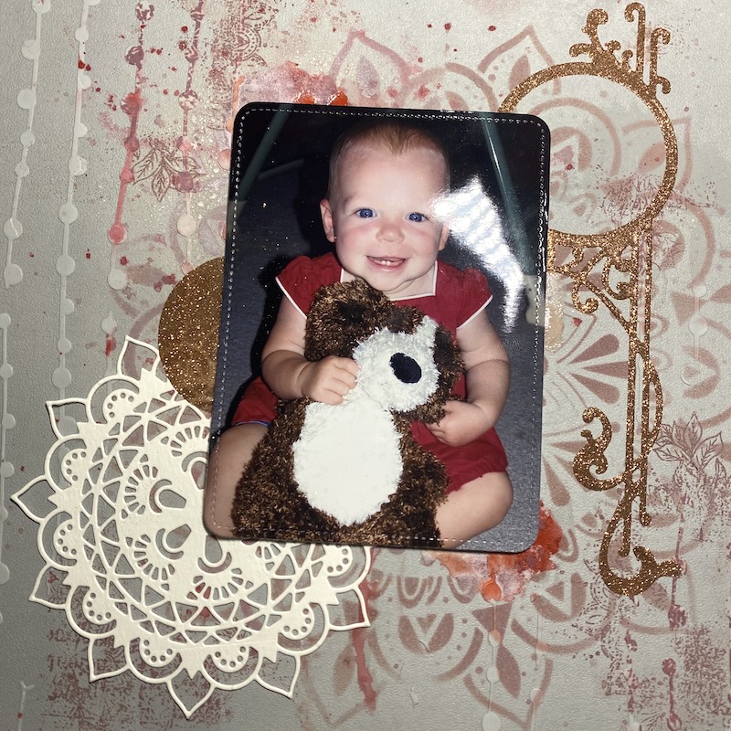 Step Ten: Adhere your picture using foam tape. Add the circle from the Elegant Ornament die cut cut in half and add it to your project in two places. Cover it in Copper Silk Microfine Glitter. Add more liquid ink color around the edges of the picture.