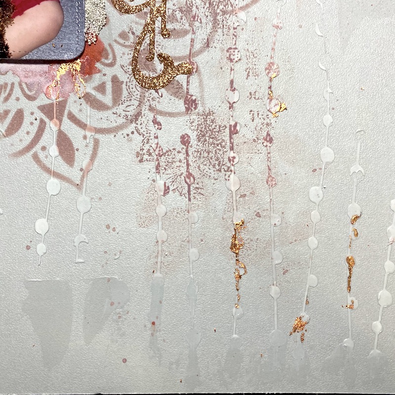 Step Three: Using molding paste, add texture by pressing the paste through the Dot, Dot, Dot… stencil. I used Golden Molding Paste.