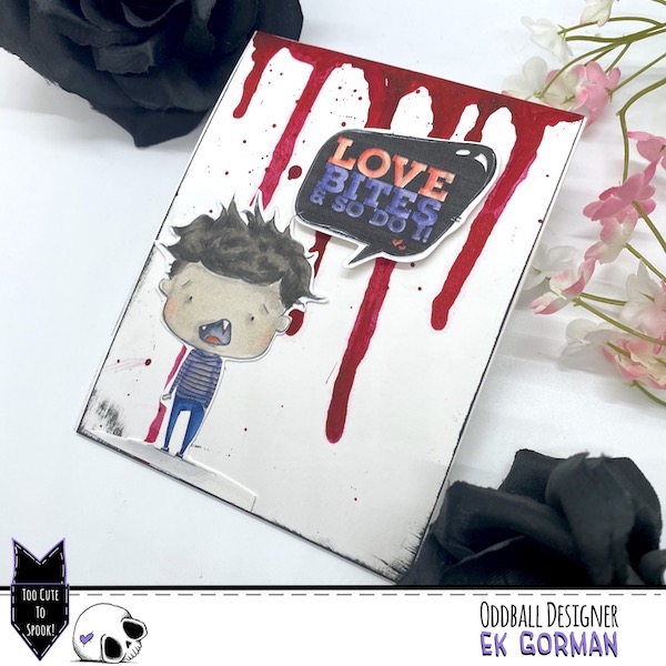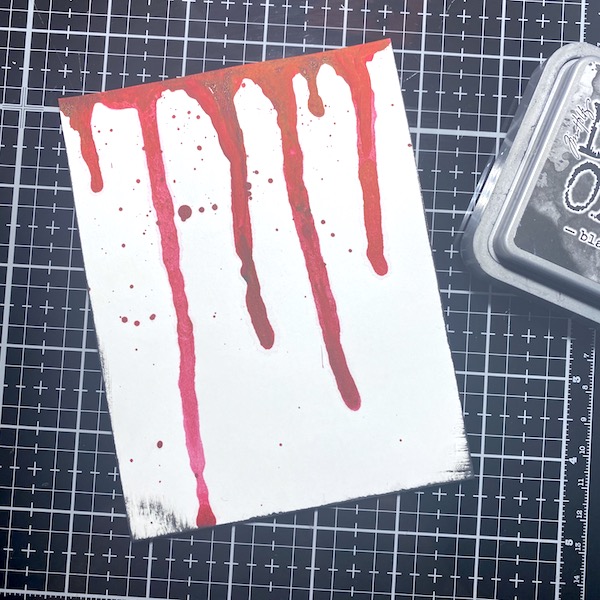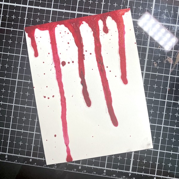 To create the background, I dripped Dr. Ph Martin’s Hydrus water color ink in red down some heavy duty cardstock along with a few well placed splatters. Let me know in the comments below if this came out just a little too realistic.