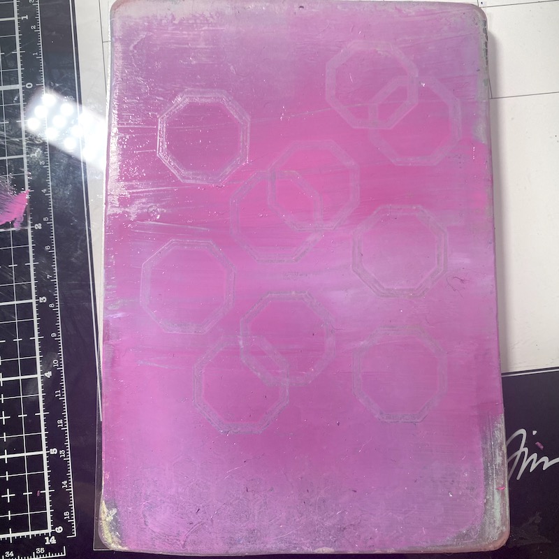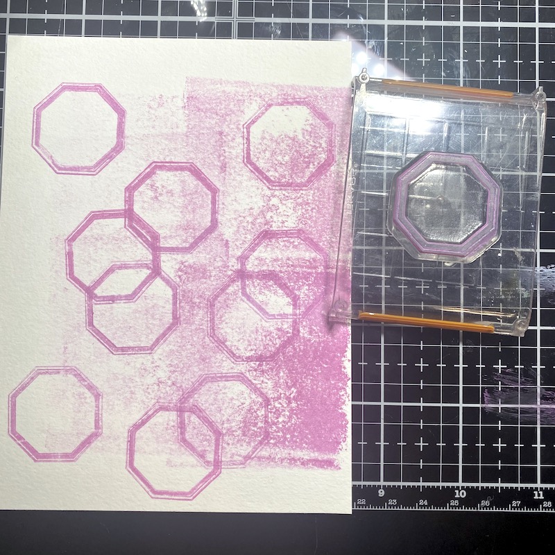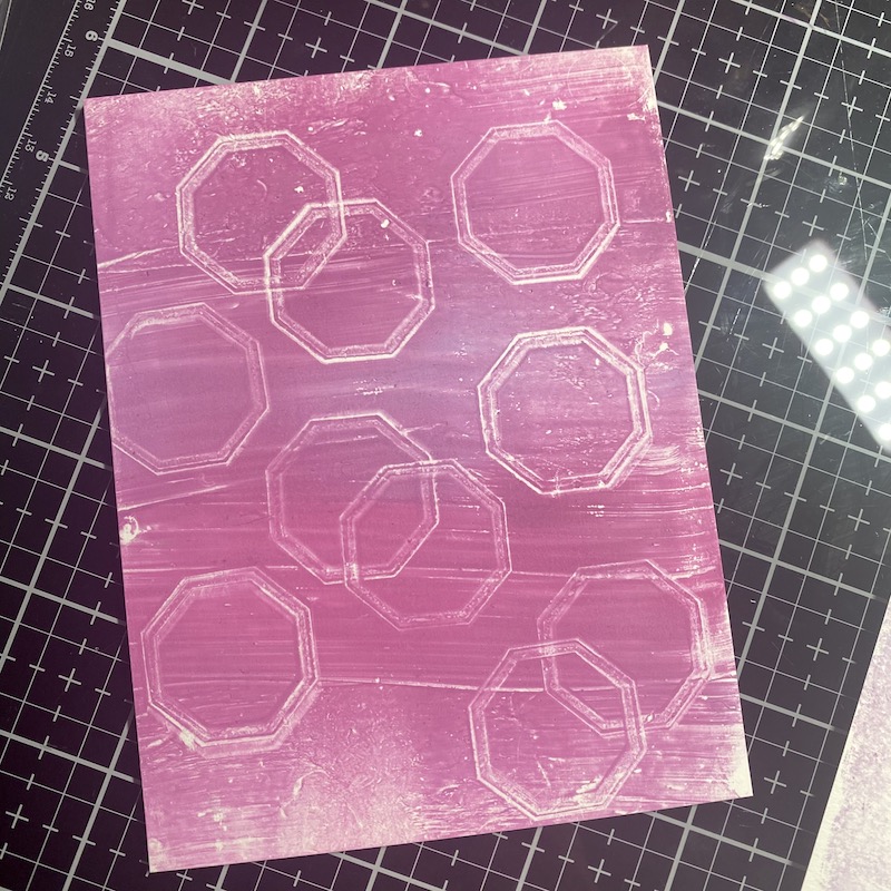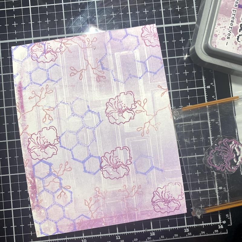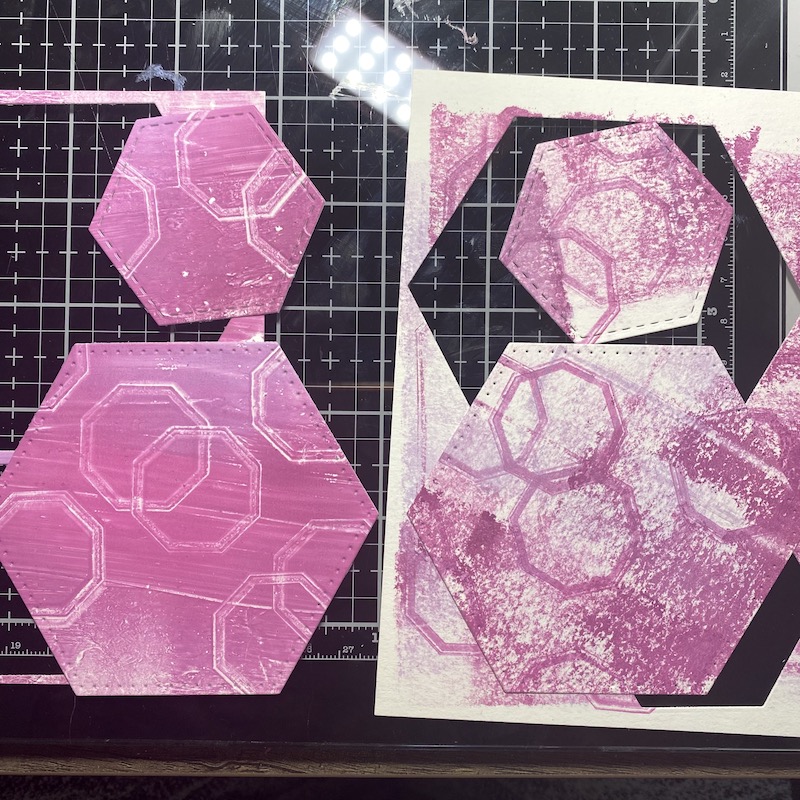 Step One: Add drops of Shaded Lilac, Picked Raspberry, and Seedless Preserves Distress Paint to the Gel Press and blend with a brayer. Stamp hexagons onto the gel press leaving a pattern using the Retro Labels stamp set..