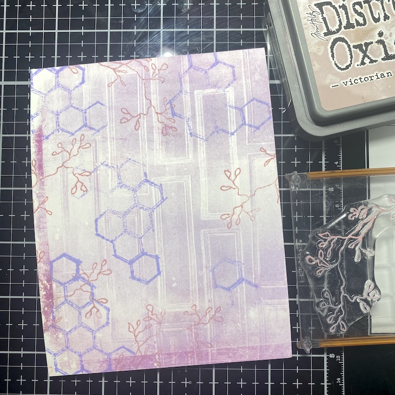 Step Eleven: Add a second layer of stamping using the whispy branches from the Spring Fling stamp set in a second color. I used Victorian Velvet Distress Oxide.