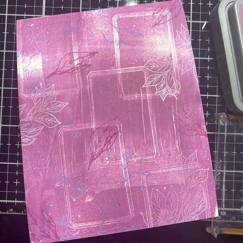Step Twelve: Add a third layer of stamping onto the second card frame. I used a floral image from the Spring Fling stamp set with Seedless Preserves Distress Oxide.
