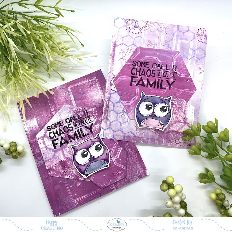 Step Ten: Repeat the background stamping on the other card frame. I used the hexagon stamp from the Pure Spring stamp set in Shaded Lilac Distress Oxide.