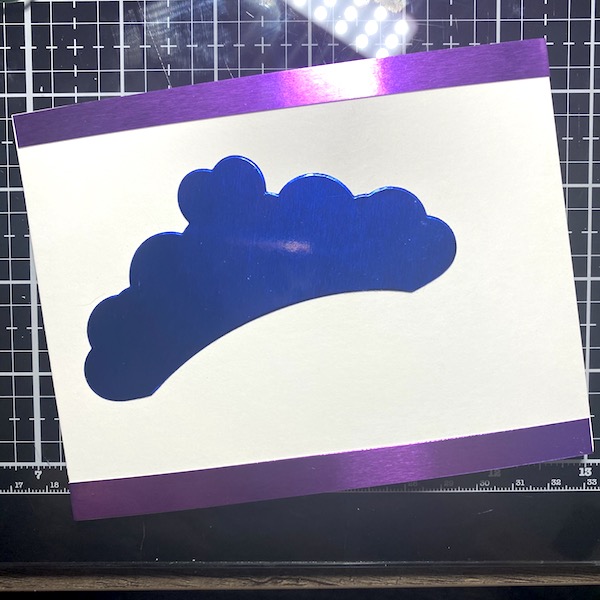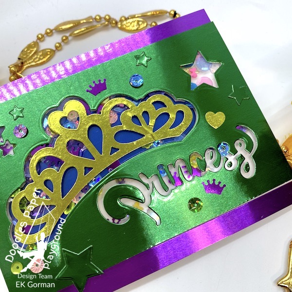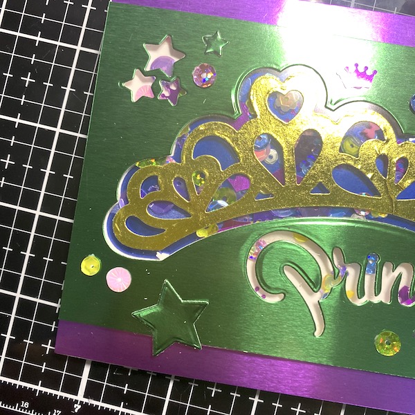 On the card frame I added two strips of purple metallic foil cardstock and a blue metallic foil crown die cut. Then I adhered the shaker pouch over the card frame.
