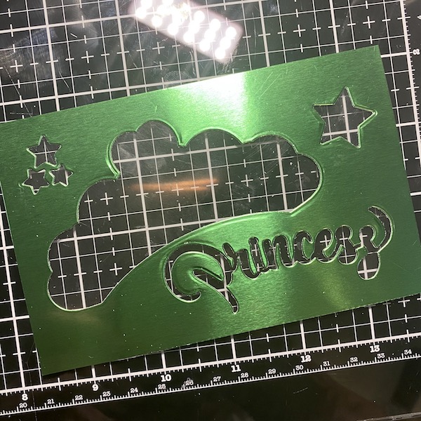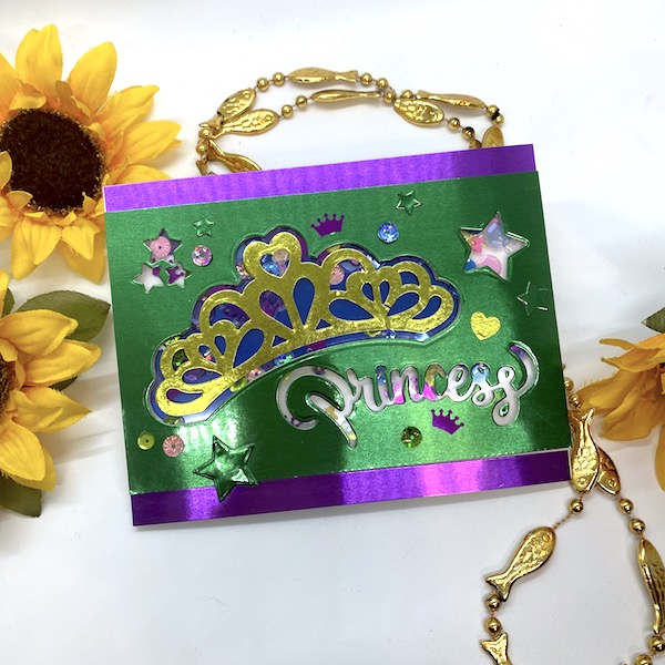 I added a sheet of acetate to the back of the foil cardstock and added the die cut outs of the ‘princess’ back into the ‘e’ and two ‘s’s. I also added the gold crown using gold washi tape sheets.
