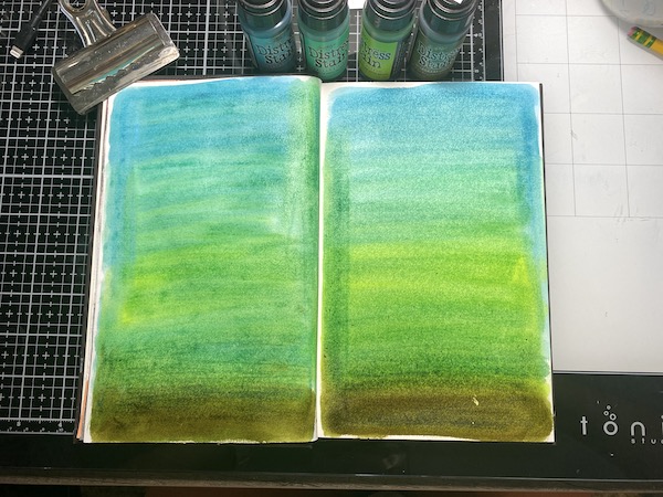 Step One: I blended distress stain over my journal pages. I blended them in an ombre attempt using Broken China, Cracked Pistachio, Twisted Citron, and Forrest Moss.