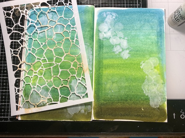 Step Two: Using a stencil and Picket Fence Distress Stain, I added blobs (not well stenciled areas) of white. I was able to push it back a little with the wet medium under it.
