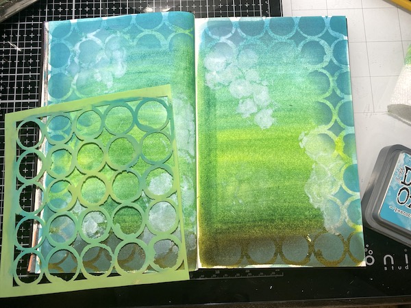 Step Three: Using second stencil, I blended distress oxide in Peacock Feather around the edges.
