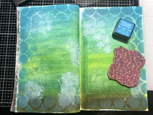 Step Four: Using dylusions ink in Calypos Teal and a dylusions stamp, I added background stamping.