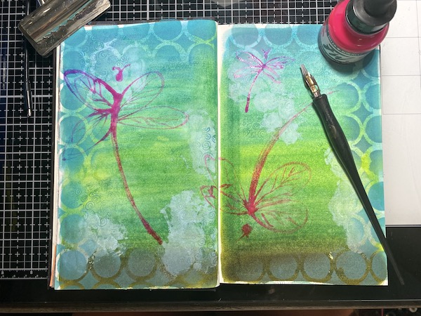 Step Five: I pulled out hot pink acrylic ink and my fountain pen with a thick nib and drew several dragon flies in different sized.