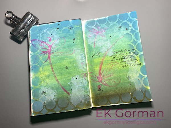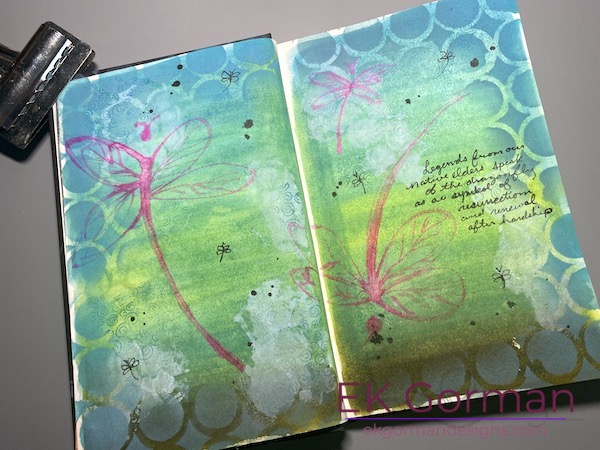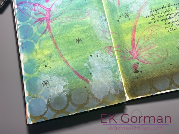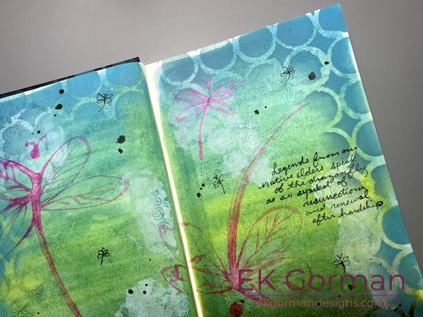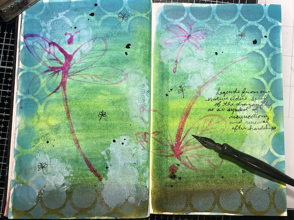 Step Five: Using a fine nib, I drew on tiny dragon flies in black acrylic ink and splattered the whole journal page. I finished by adding the suggested quote with the same fine nib.