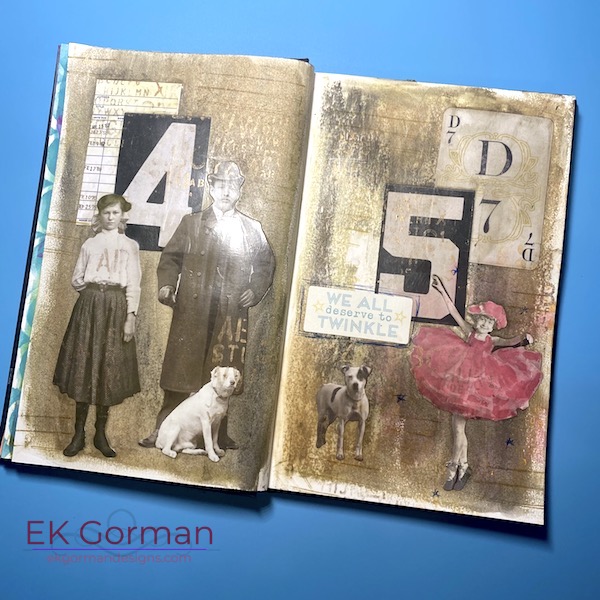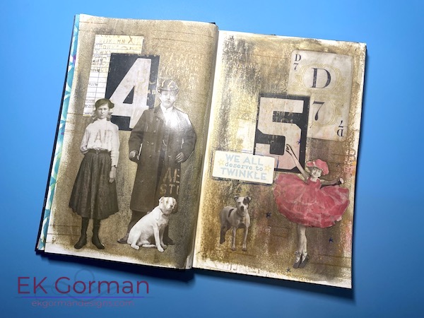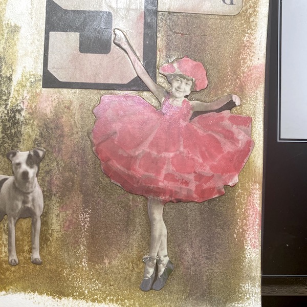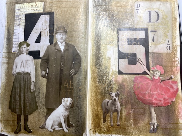 Week’s four prompt was paper dolls with a collage technique. This wasn’t quite the suggestion for the technique, but I wasn’t feeling the original suggestion, so I simply pulled out some already paper dolls and collaged them with other ephemera into my art journal.