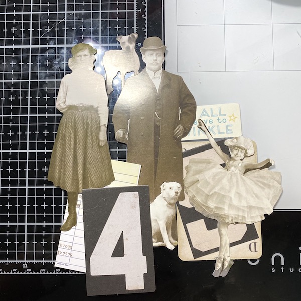 Step One: I pulled three Tim Holtz paper dolls (and an extra dog) out and a few other pieces of ephemera that I felt coordinated well.