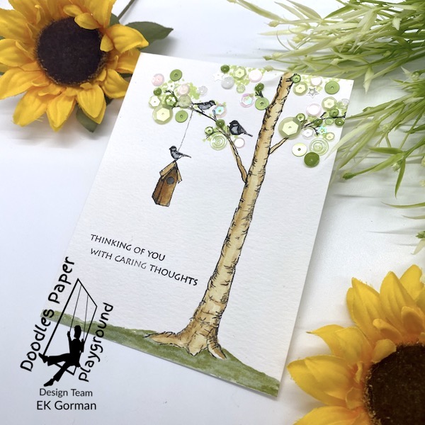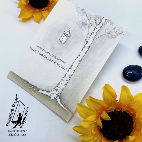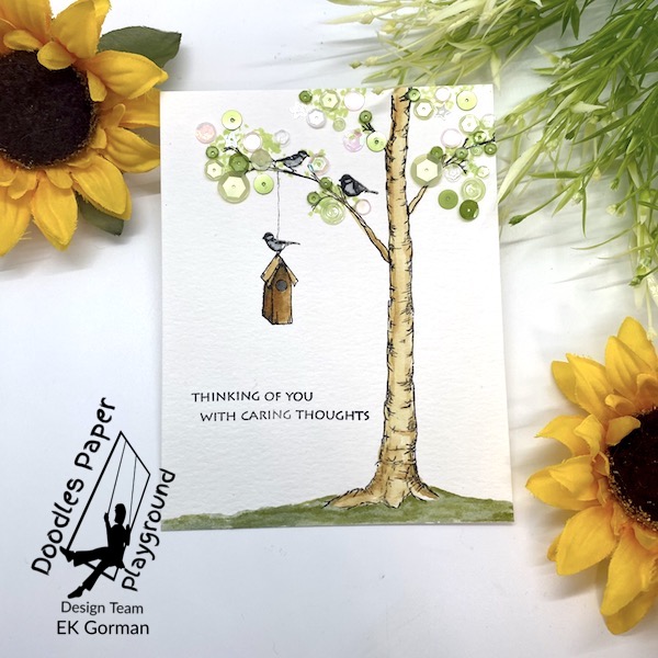 So I know I am not ‘suppose’ to have favorites, but I do. I know I am not ‘suppose’ to use old stamps and instead invest in new, but I don’t. I know I am not suppose to reuse a stamp set for another project, but I do. And this is one of those stamp sets. I used it any time I need a think of you or sympathy card. And frankly it has become one of my favorite stamps when I want to show off a gorgeous blend of sequins from Doodle’s Paper Playground.
