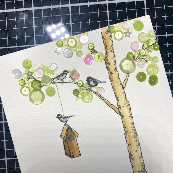 I had adhered the sequins onto the branches, using a mix of the large and small sequins from Fawn’s Budding Leaves Sparkle Blends mix. I love how this blend really looks like budding leaves against the tree.
