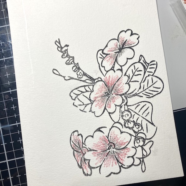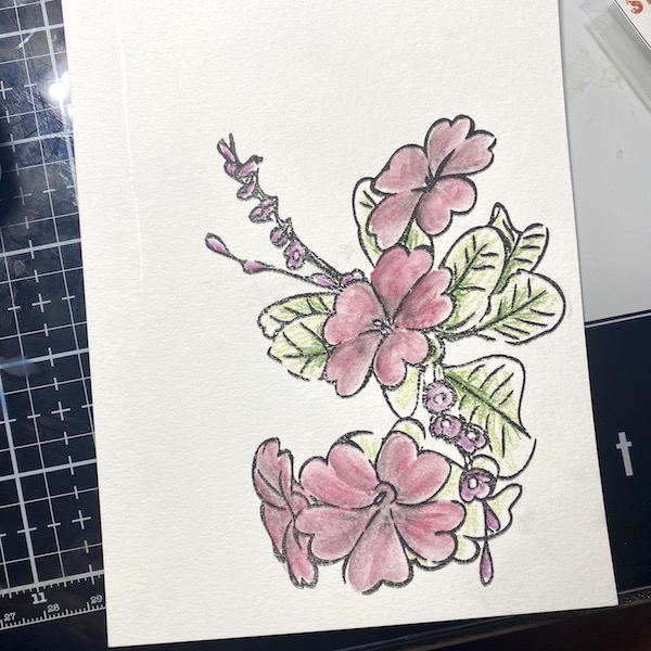 The flowers looked a little drab, so I punched up their color, still using just the red and black watercolor pencils. I also added a heavy shadow around the bottom of the florals.
