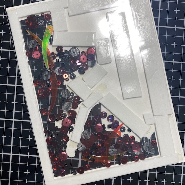 I adhere the shaker window to an A2 card frame, leaving the background white, hoping to keep the image light.