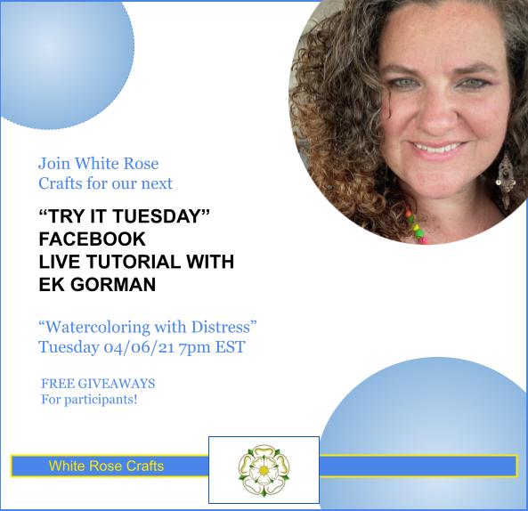 Make sure you tune in tonight to White Rose Crafts Facebook Page. I will be going Live for their Try It Tuesday, and will be sharing tricks and techniques to watercolor with all types of Distress.
