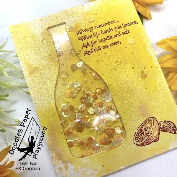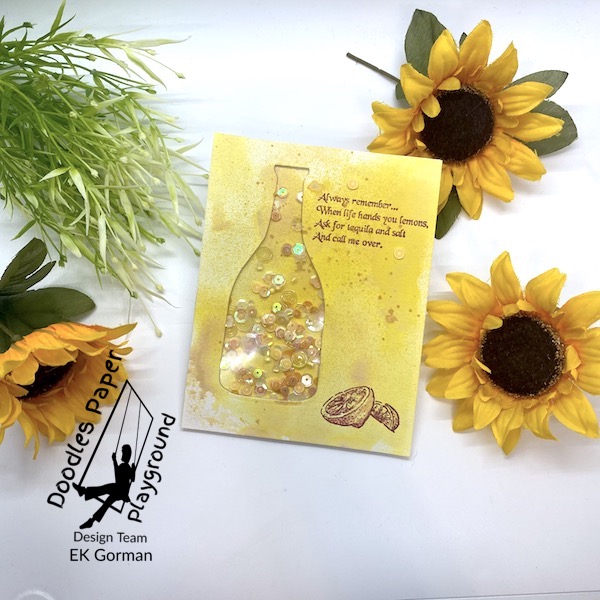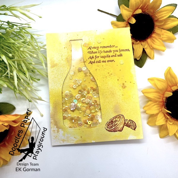The die cut that created the shaker hole was from Ellen Essentials. The fun tequila sentiment was from Rubber Cottage. The beautiful lemon half was from Penny Black and stamped in Scrapberry Brown Stains Ink.