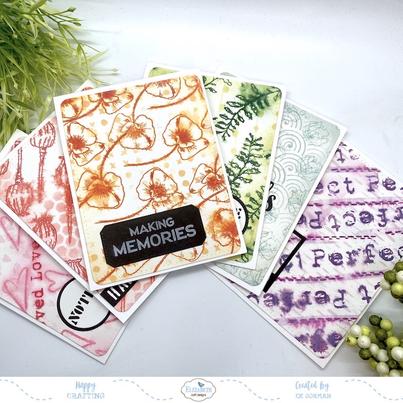 I am up on the Elizabeth Craft Designs Blog today sharing how I created these six cards by hand stamping my own printed paper using Ilse and Charlene’s stamps and stencils.