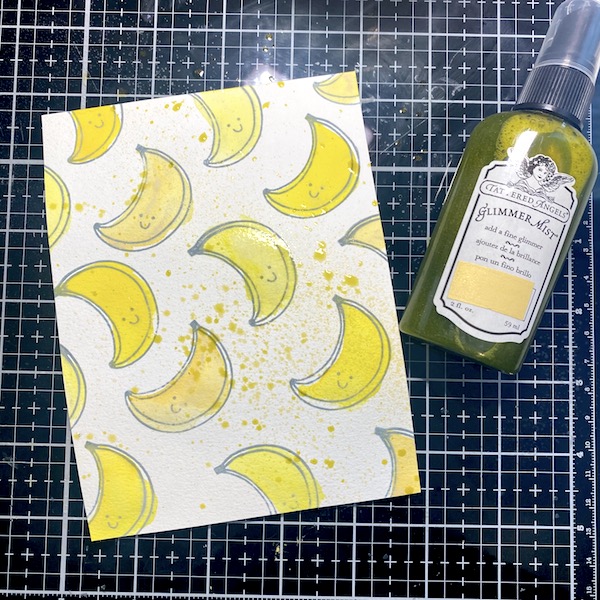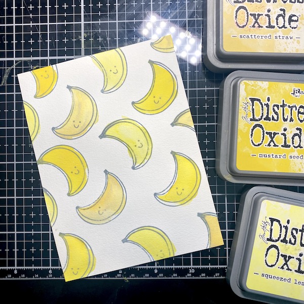 I started by stamping the banana stamp over and over again onto some watercolor paper. I then watercolored in the images with three shades of yellow, including Scattered Straw, Mustard Seed and Squeezed Lemonade Distress Oxides.
