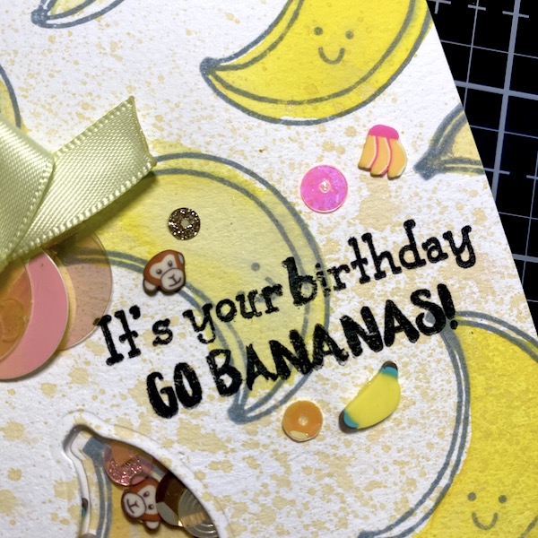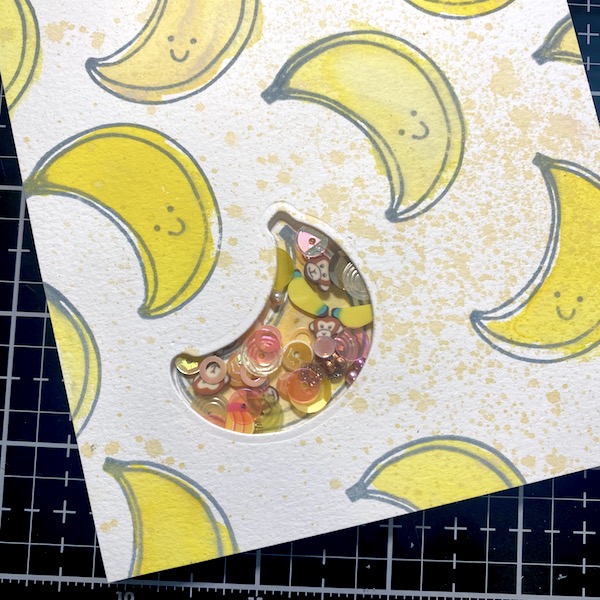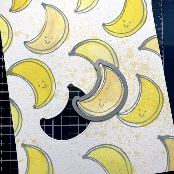I added the die cut to the A2 card frame so it would show through the opening and filled the shaker pouch with the Go Bananas mix.