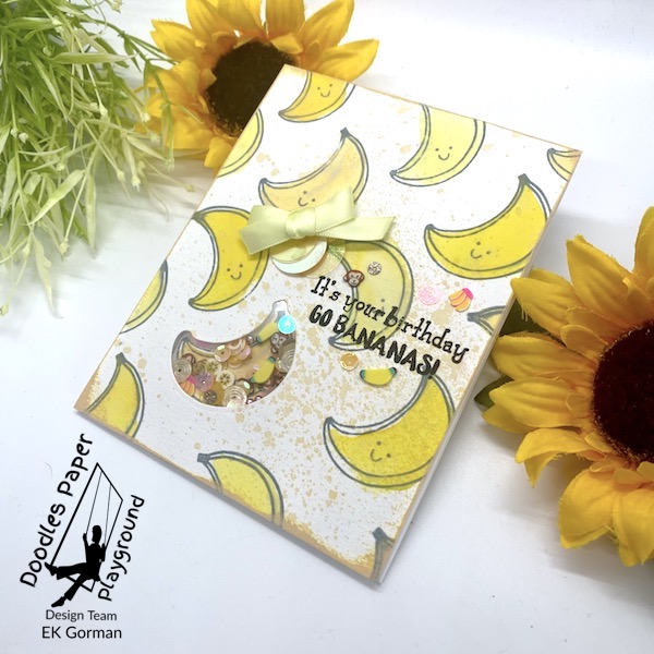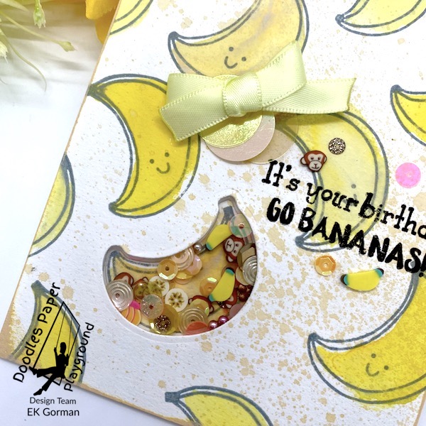 So today I am playing with the new Go Bananas Sparkle Blend mix from Doodles Paper Playground. Obviously the natural image to coordinate with this fun mix would be a monkey, but I decided to veer and use this fun banana stamp and die set from Paper Smooches.
