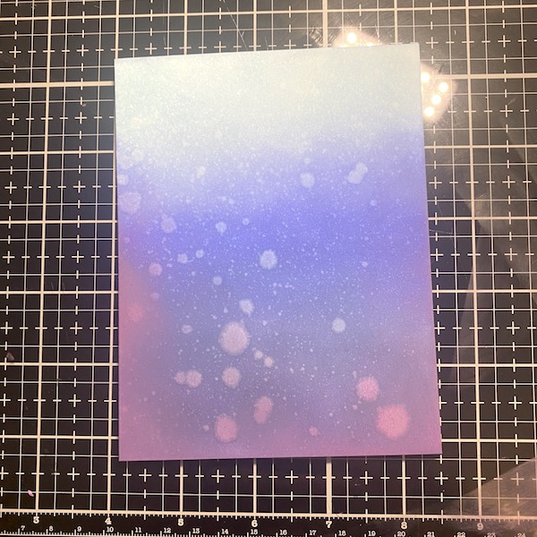 Step One: Blend three four shades of Distress Oxides to create both an ocean and a sky. I used Tumbled Glass, Stormy Sky, Blueprint Sketch, and Chipped Sapphire. I then sprayed clean water onto the inks.