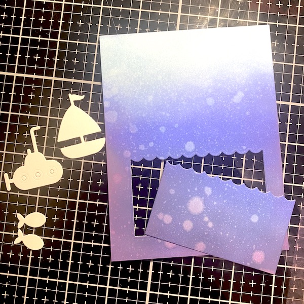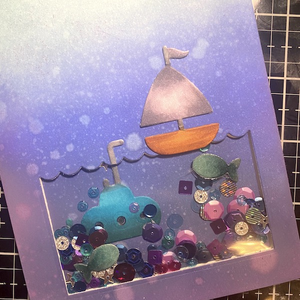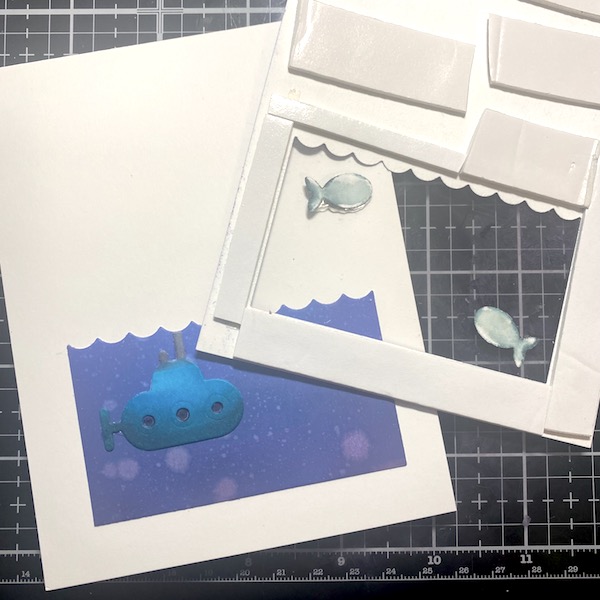 Step Three: Using a the Water Window die set from Your Next Die, die cut a hole in the cardstock to create your shaker window. I also die cut some fish, boat, and sub on white cardstock.