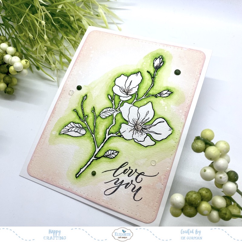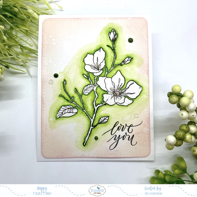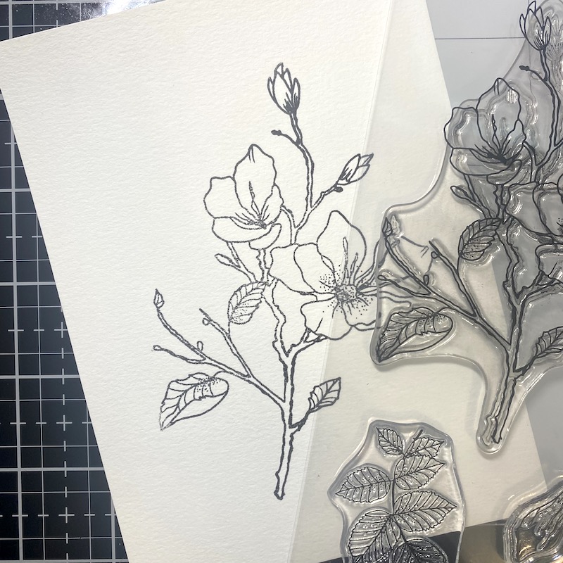 Step One: On a piece of trimmed Watercolor Paper, stamp the floral image from the Beautiful Blooms Blossom stamp set in waterproof ink.